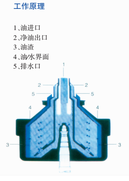 利用油、水、杂质三者之间的密度差,在高速旋转的转鼓中产生不同离心力。使得油、水、杂质很快分离。杂质沉淀在转鼓的周边,由人工定期清除。净化后的油和水份分别从出油口和排水口排出。根据油中水分、固态杂质含量多少,可将离心式分离机的转鼓安装成分水分杂转鼓或分水转鼓。油中含微量水分或不含水分时安装成分杂转鼓,用来去除杂质。离心式分离机的转鼓安装成分水分杂转鼓,即:油/水/杂质分离的原理:流入离心式分离机的润滑油从进油口1流经分流筒进入碟片组的间隙中,高速旋转的转鼓产生比重力大数千倍的离心力,在这种离心力的作用下,将油中的固态杂质和水分甩到转鼓的周边,固态杂质(油渣3)沉淀在转鼓壁上,由人工定期清除,水分从排水口5被排出。净化后的润滑油向转鼓中心移动,通过碟片组的间隙从净油出口2流出,回流到油箱中,这样就达到了净化的目的。
