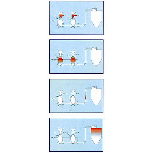 打开出料阀,然后主输送器的进气阀打开,压缩空气将灰从所有的NPT型泵输送到中间仓或灰库。